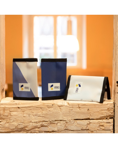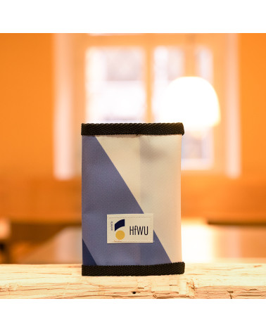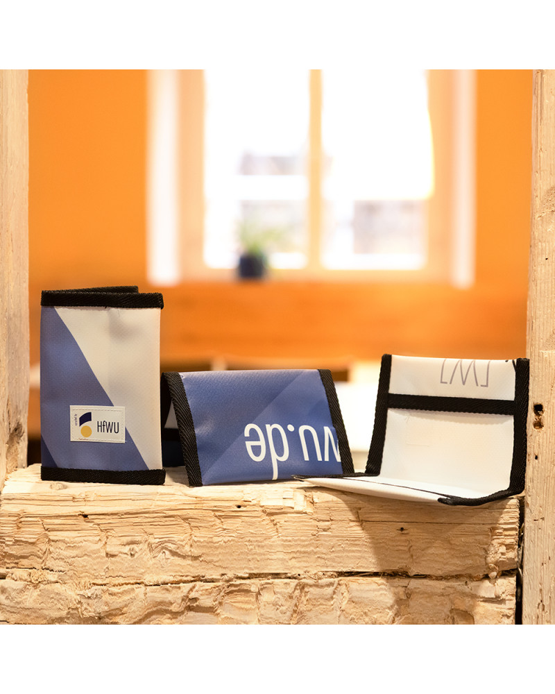Aus an der HfWU gebrauchten Roll-ups recycelt und von einer integrativen Maßnahme in Süddeutschland genäht.