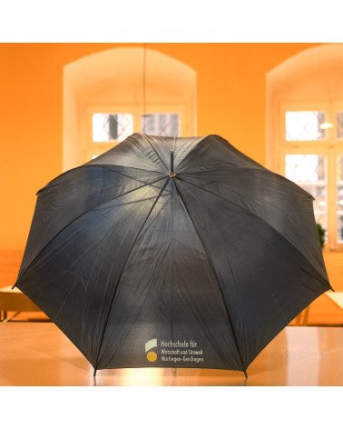 Schwarzer Stock-Regenschirm mit HfWU-Logo.